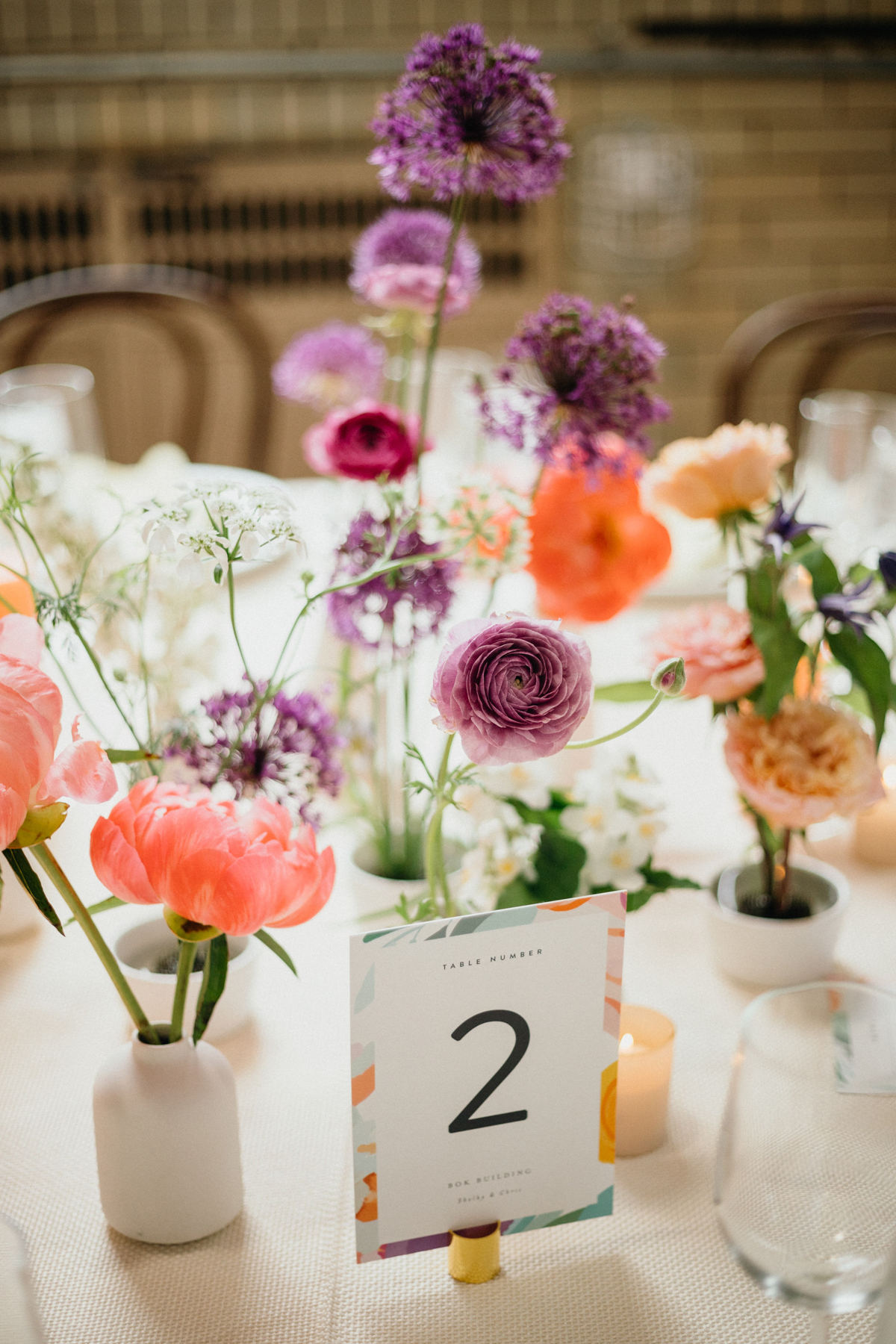 When it came time to party, the gymnasium was unrecognizable—Pampas and Poppy Co. had transformed it into a colorful masterpiece. Bud vases lined the tables, paper lanterns floated overhead, and a disco ball anchored the space, scattering light like tiny stars. The dance floor, with its hanging flowers and lanterns, felt like stepping into another world. And let’s not forget the chalkboard signage, a playful nod to BOK’s schoolhouse roots. The seating chart, made with brightly colored Post-it notes, was both fun and functional, while the bar menu’s soft rainbow hues were an unexpected visual treat. It was a reminder that weddings don’t have to follow any rules to be absolutely unforgettable.