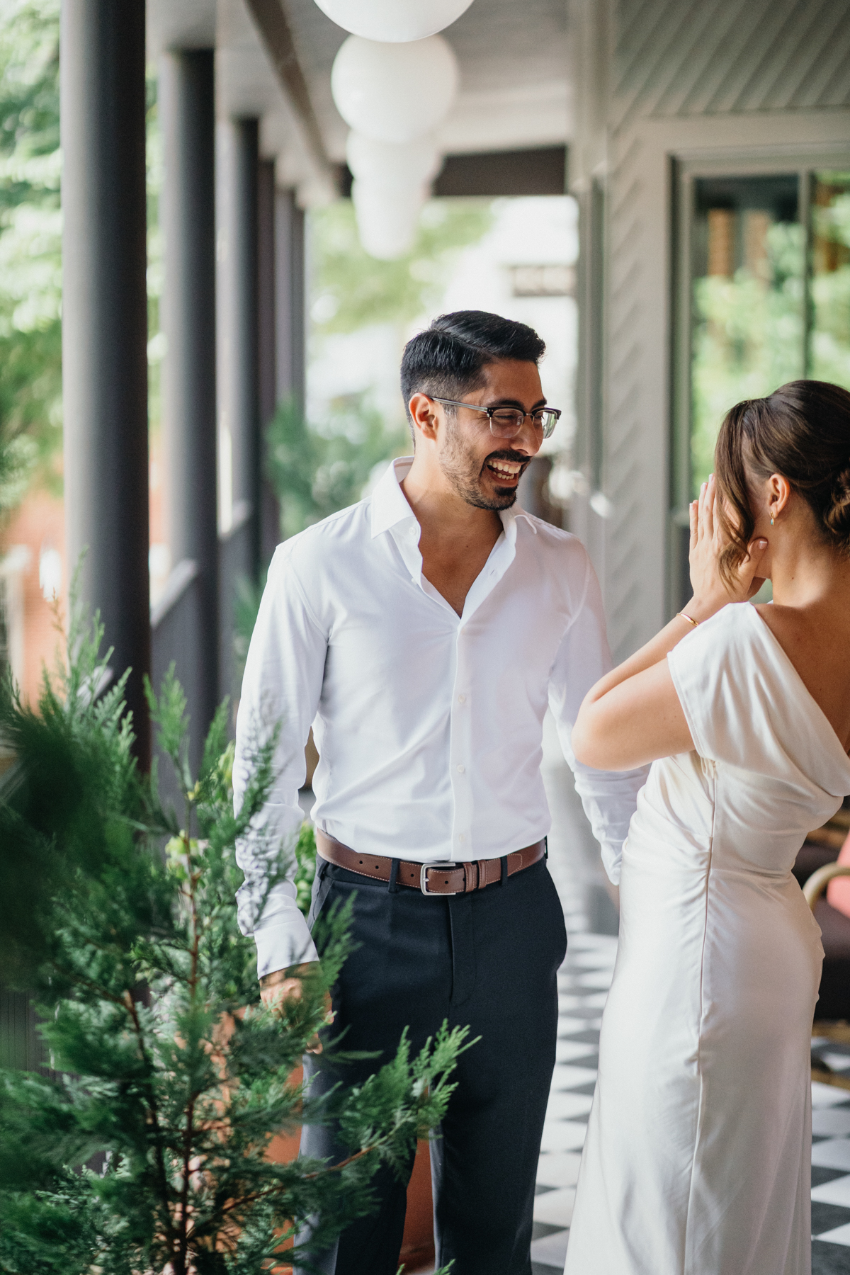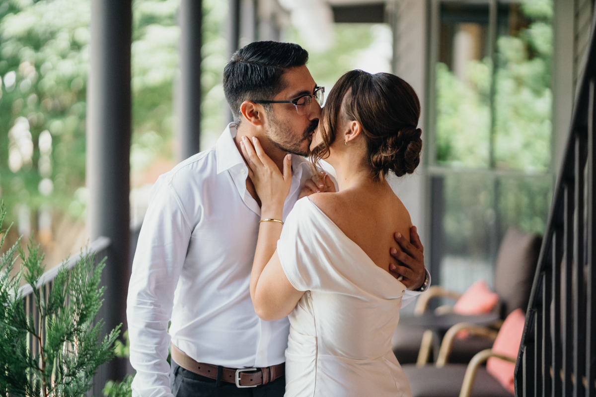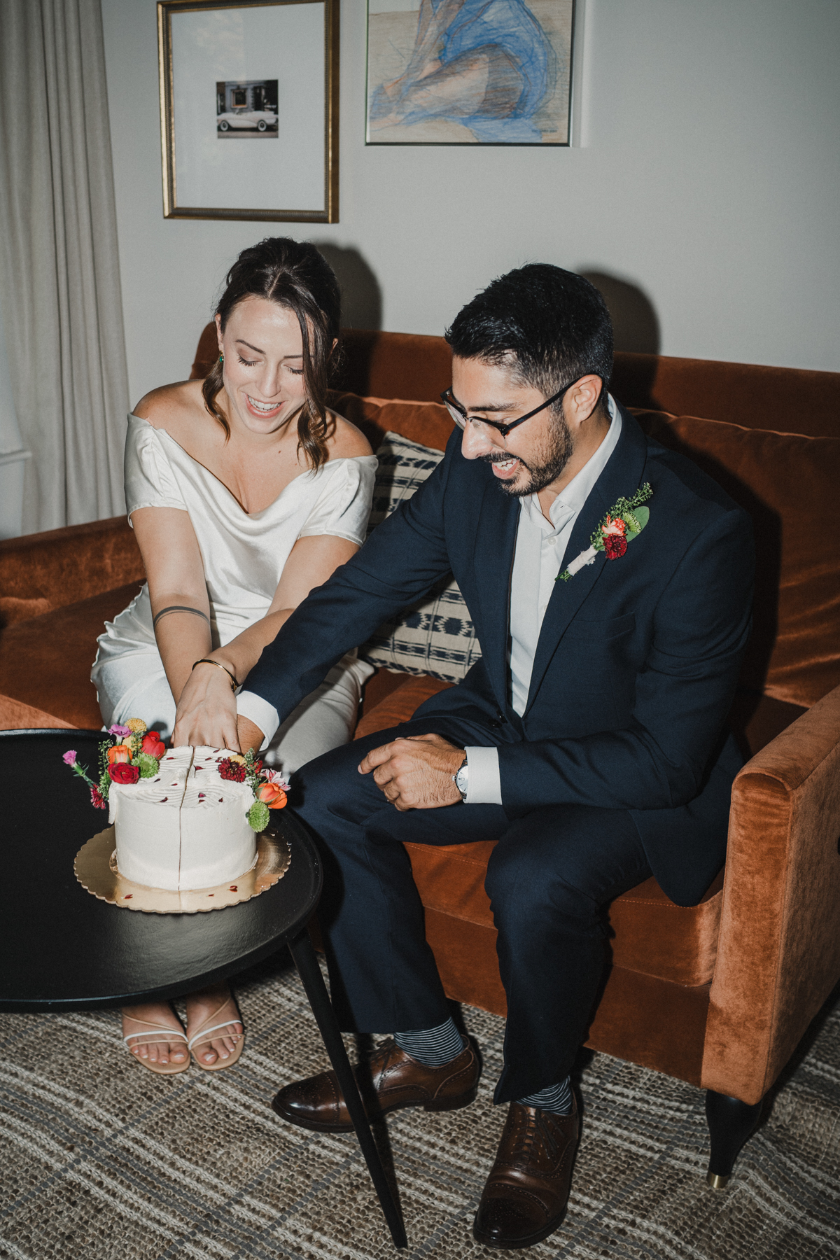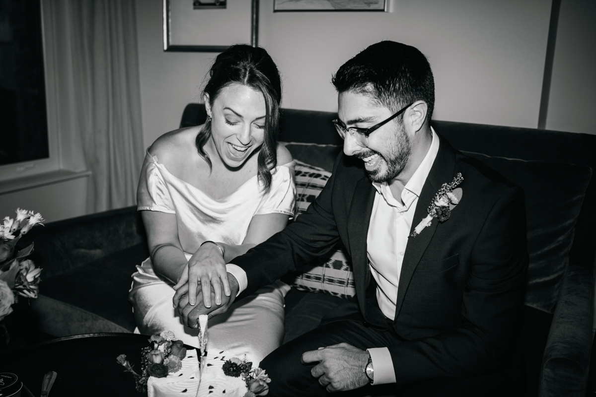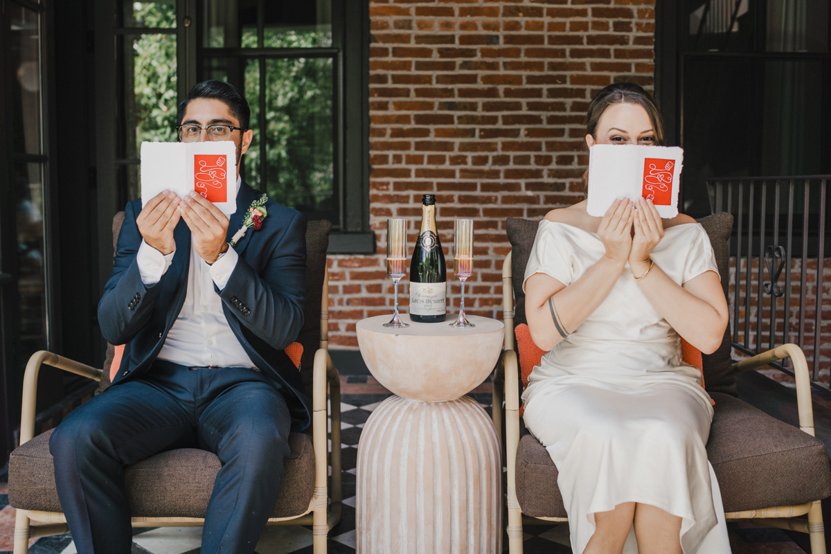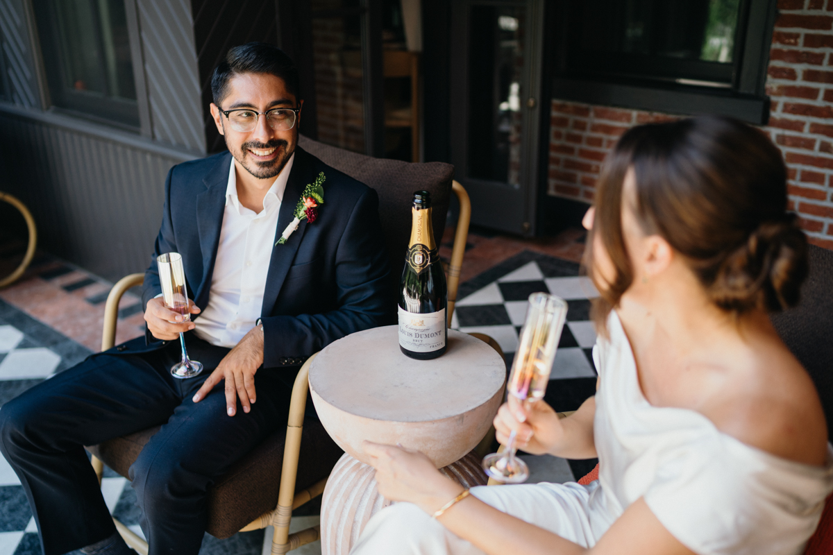 They started the morning at Anna & Bel, a boutique hotel in Fishtown with mid century modern charm. After getting ready together, they signed the official papers and made it all real. The celebration came right after with champagne and a vintage inspired cake with textured white frosting. It was simple, sweet, and full of joy. We captured portraits around the hotel before heading out, soaking in the calm before the city became part of their story.
