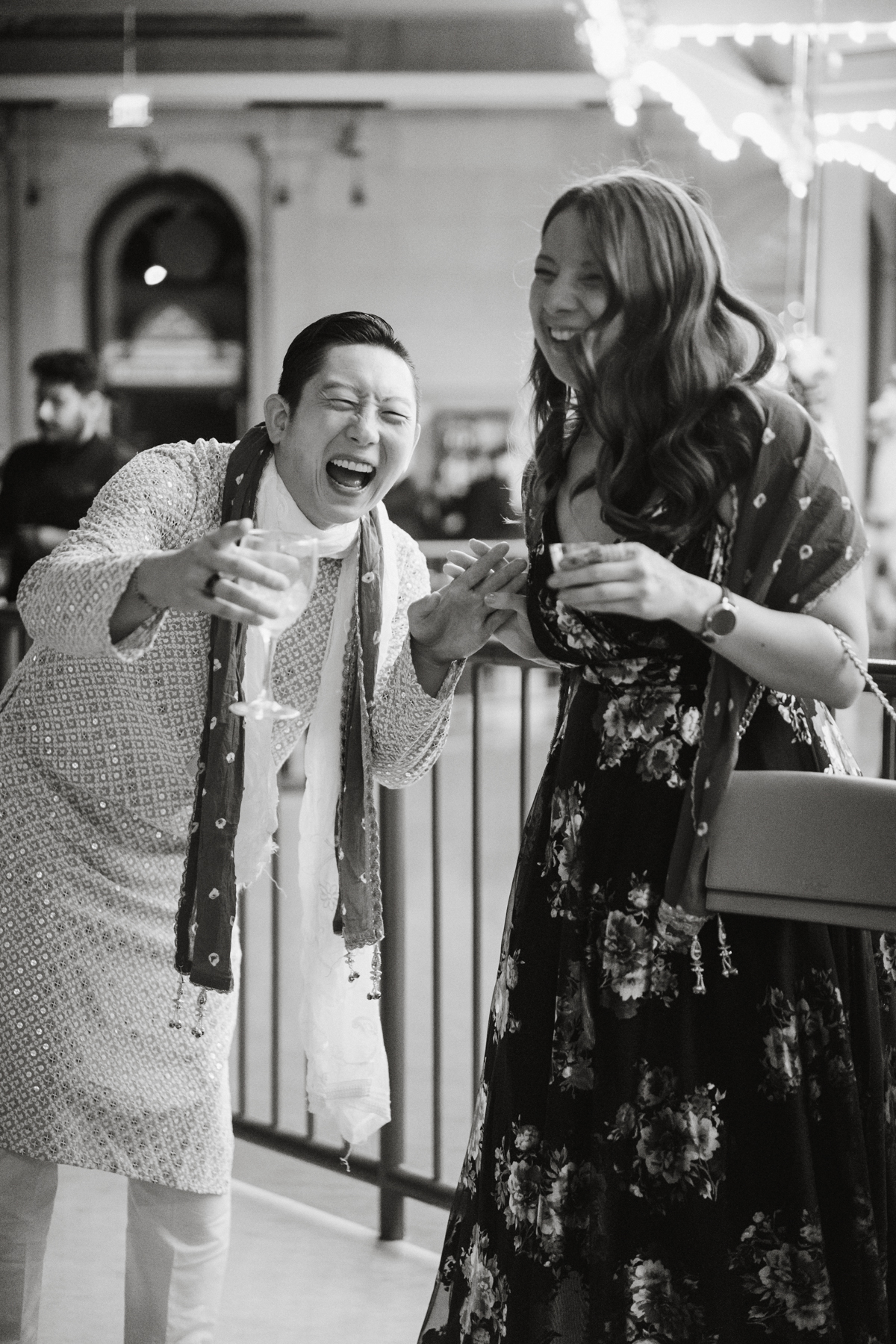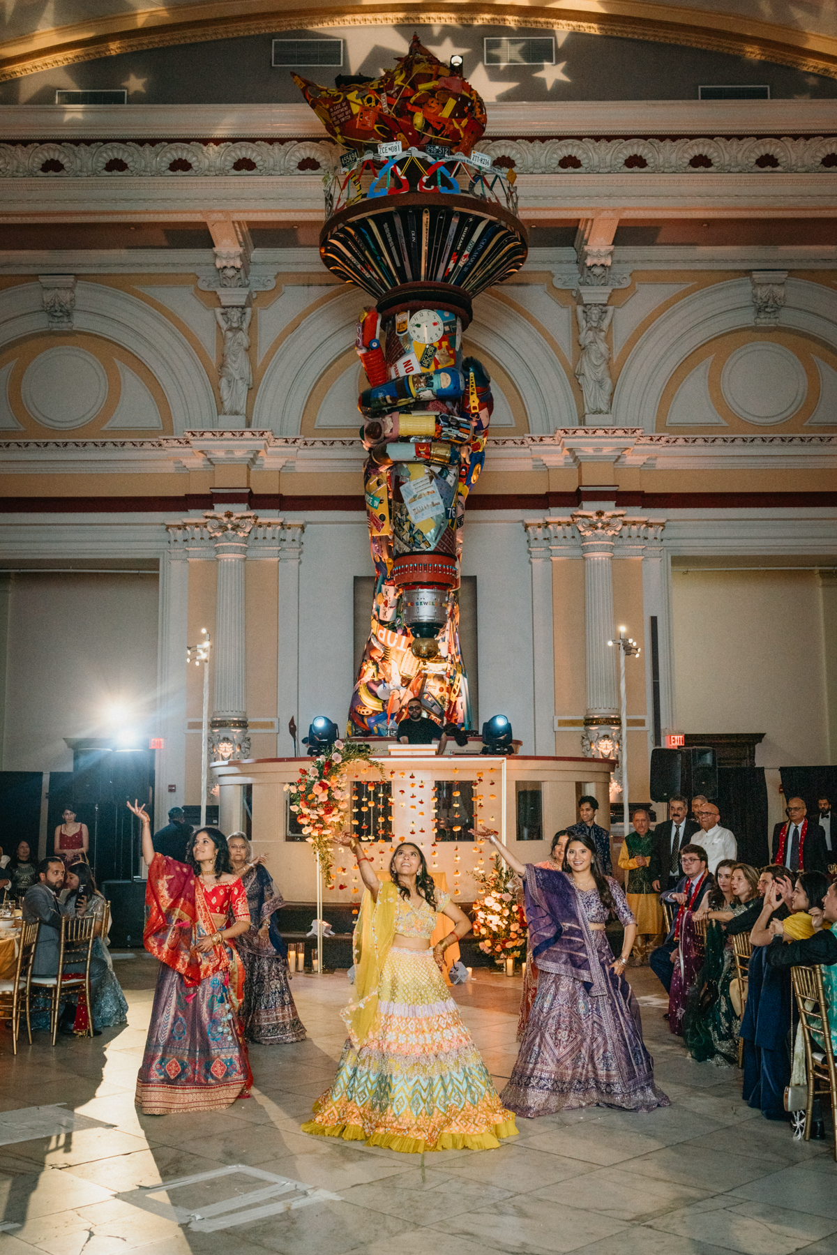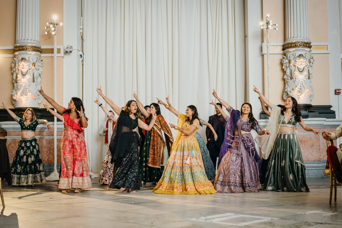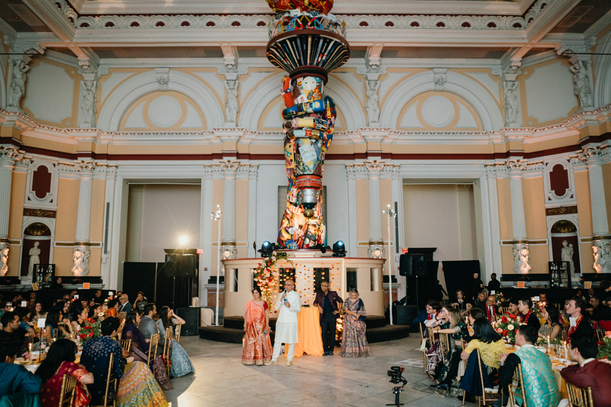 As guests moved into cocktail hour and dinner, the evening kept unfolding with heartfelt speeches, incredible dances, and the kind of energy that makes photographing a reception pure fun. The Please Touch Museum is such a photogenic venue for a Philly wedding photographer. The grandeur of the space, the iconic carousel, and the way history and playfulness combine made it unforgettable. Some of our favorite shots from the night were on that carousel, Rahkee’s orange outfit whirling against the lights, her intricate Philly-inspired henna on full display.