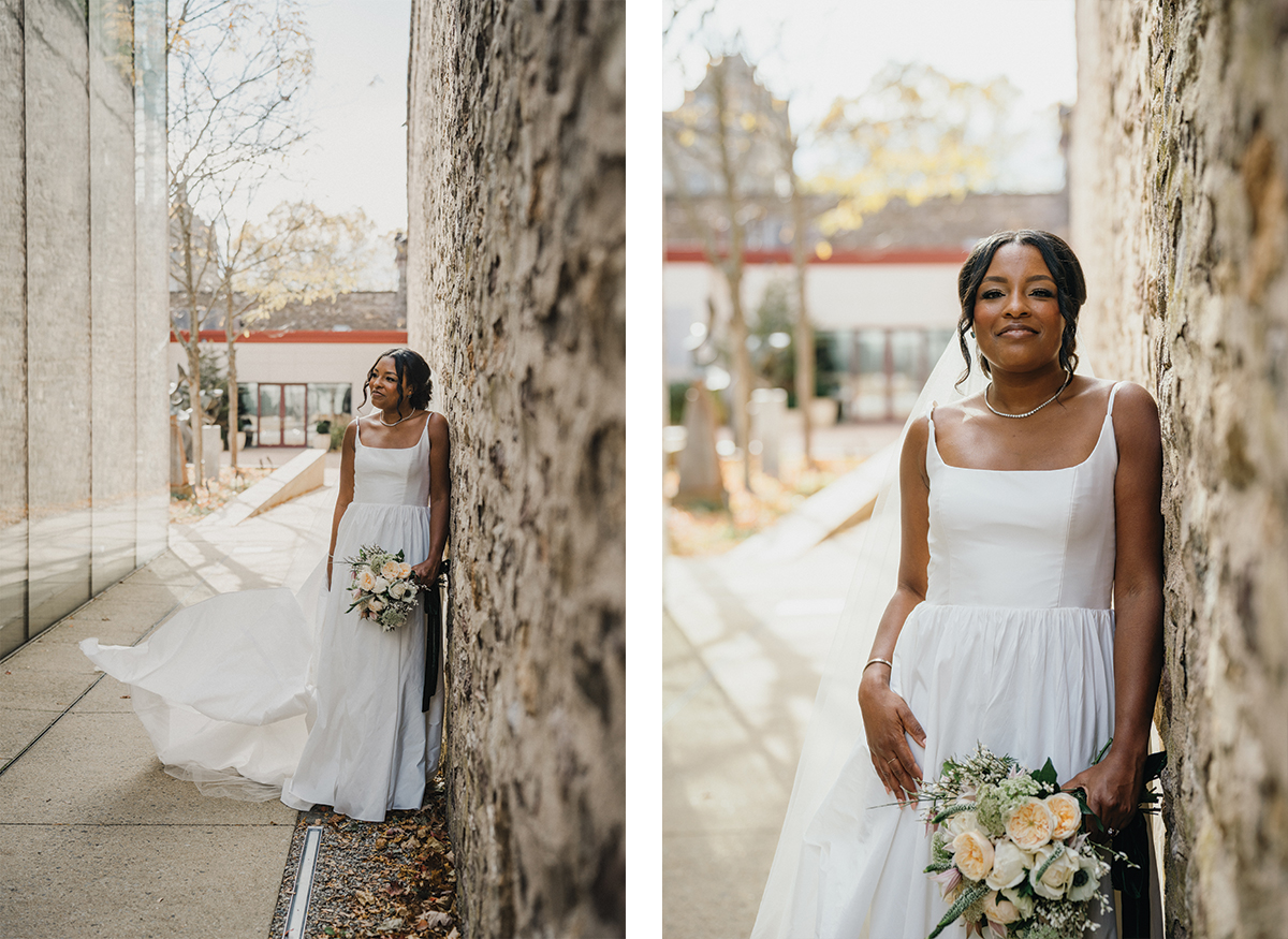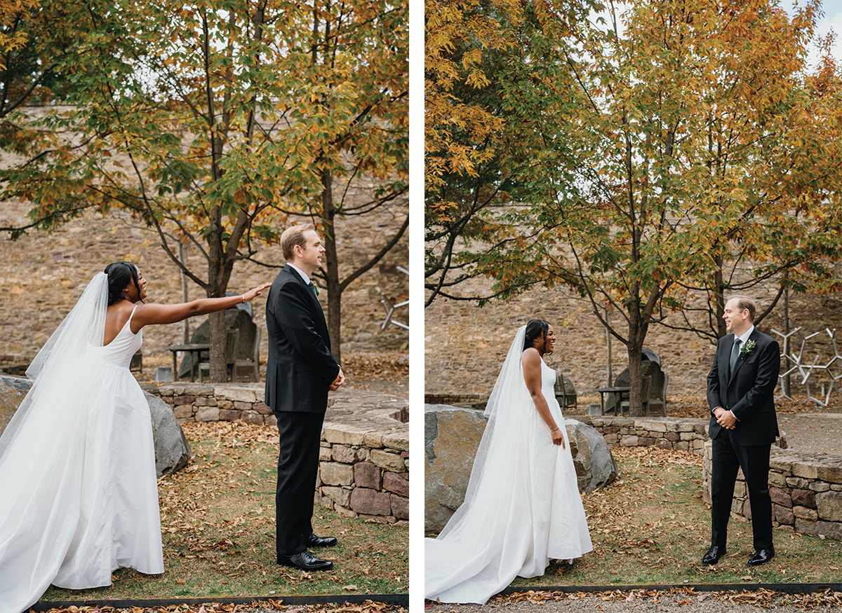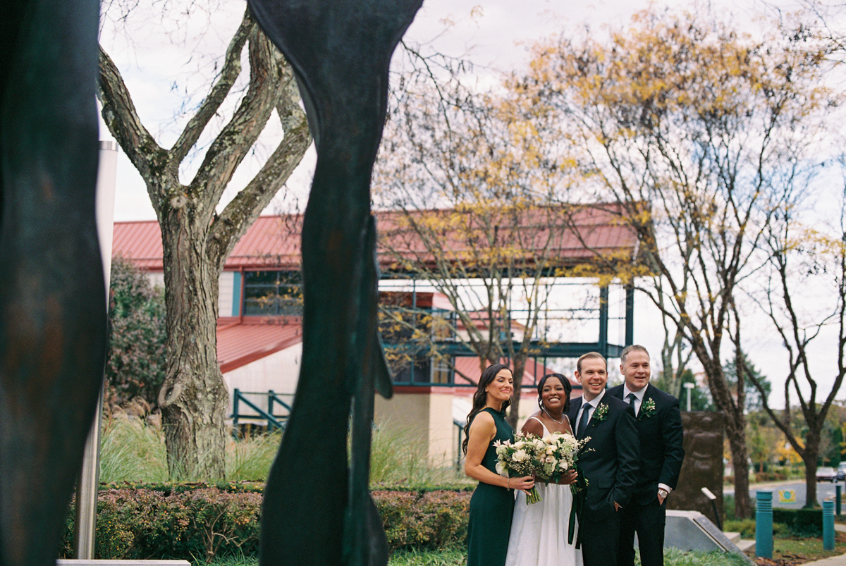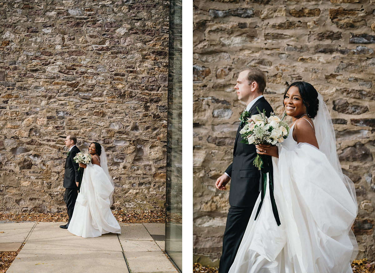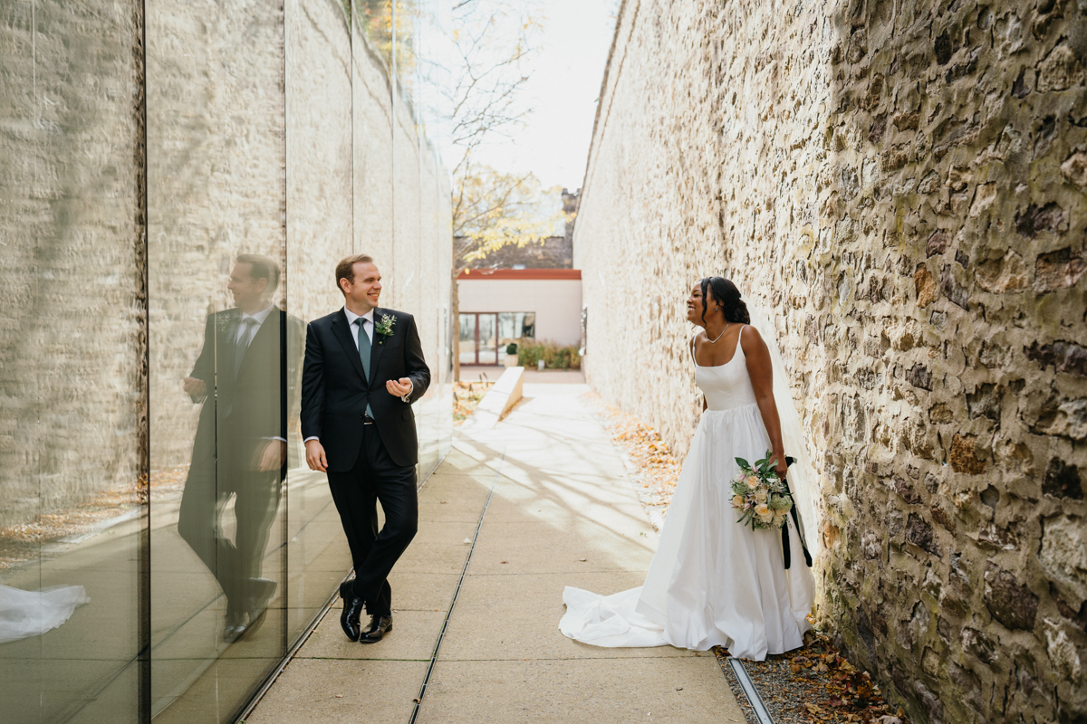 Brooke and Robert’s October wedding at the Michener Art Museum felt intentional from the first step into the courtyard. The trees held warm fall tones that framed the space naturally, especially in the museum’s open-air courtyard and sculpture garden, where their ceremony took place. The museum carries a rare kind of quiet grandeur. It invites celebration without overshadowing it. We moved through the galleries for portraits, letting art and architecture become a backdrop rather than a distraction. Brooke and Robert shifted easily between sincere moments and lighthearted ones, and that range made photographing them feel natural and unforced.