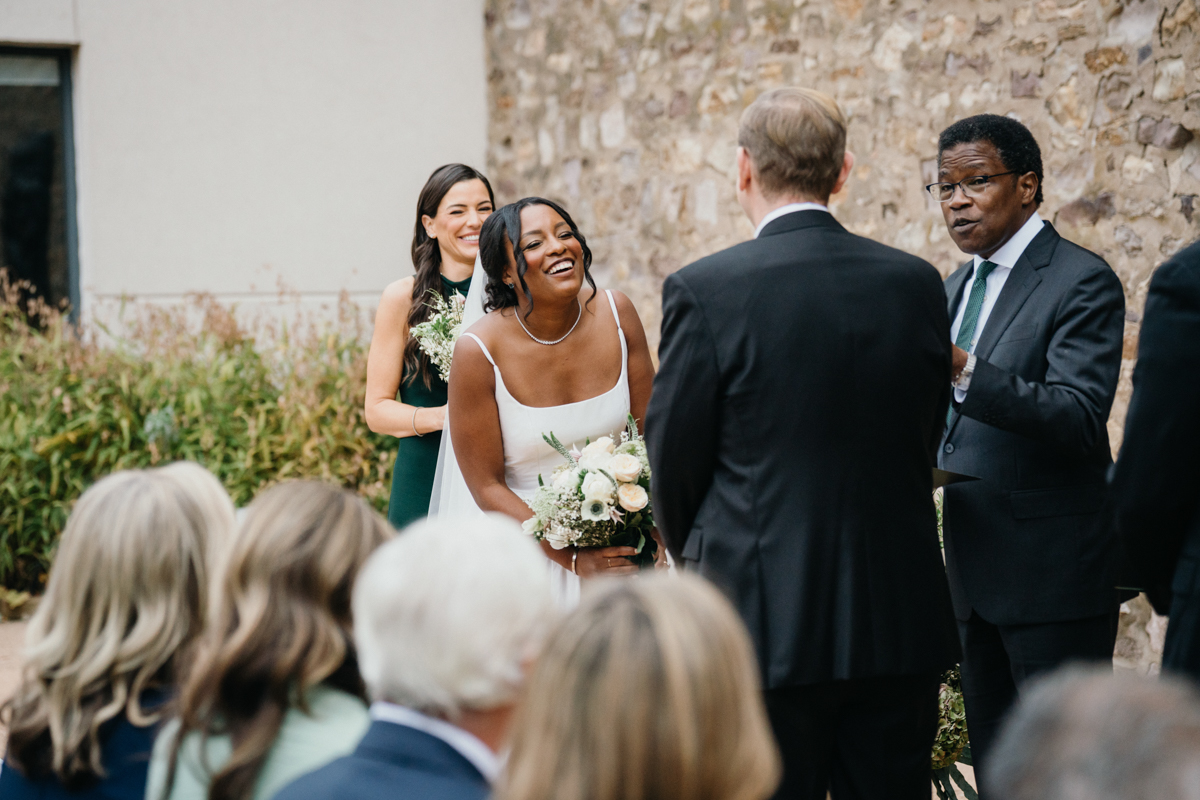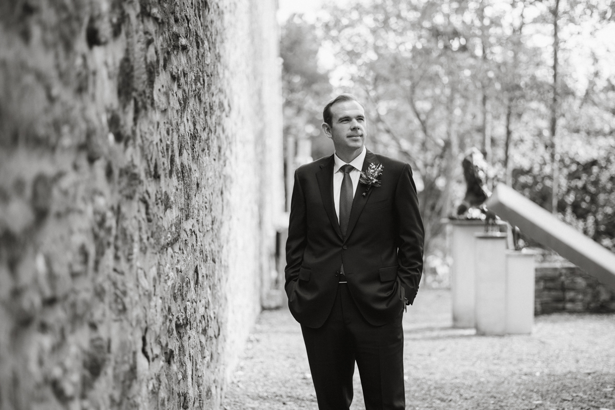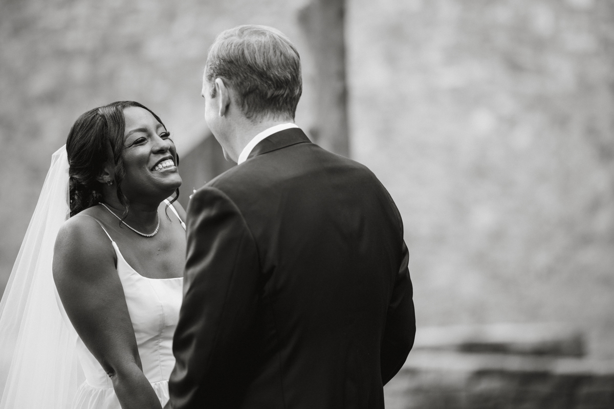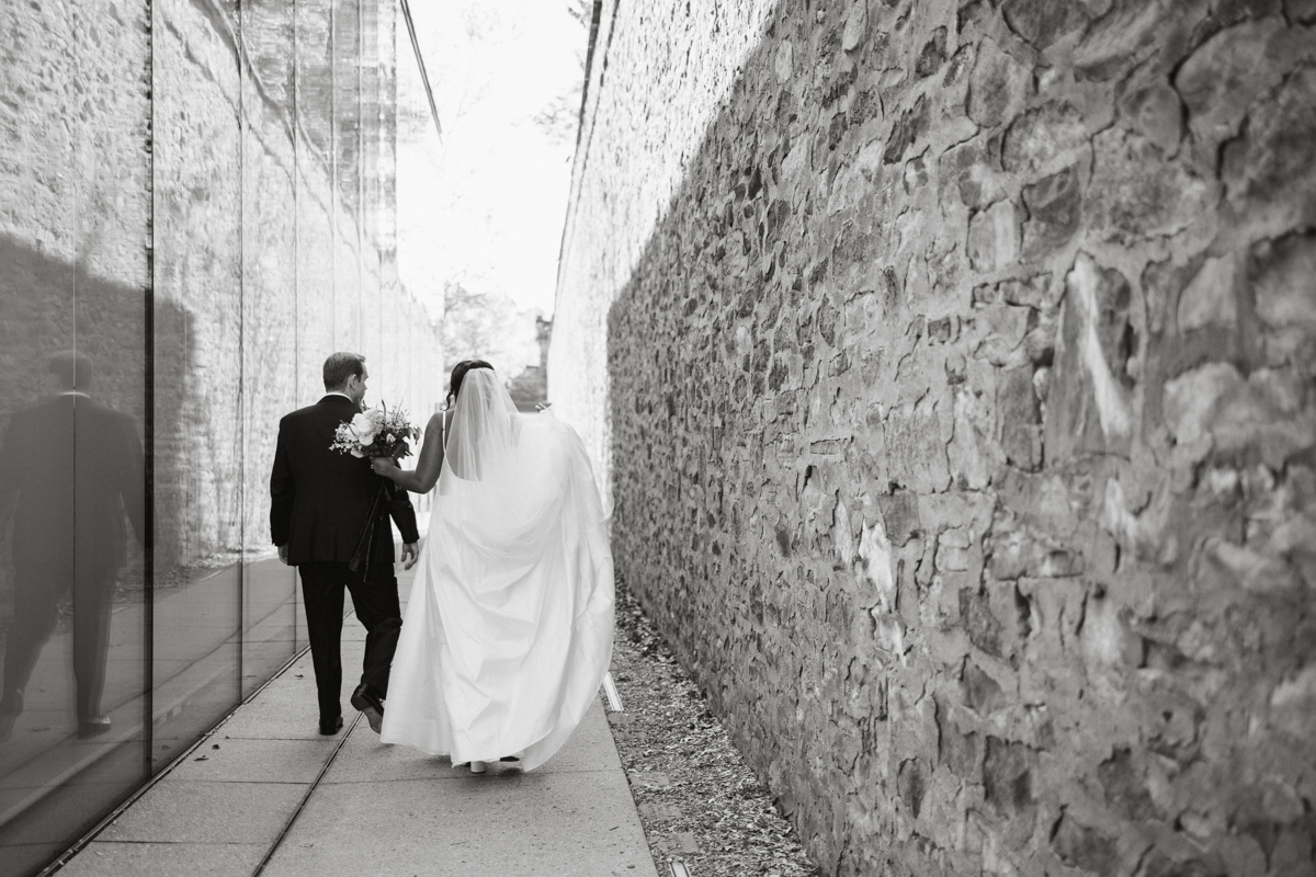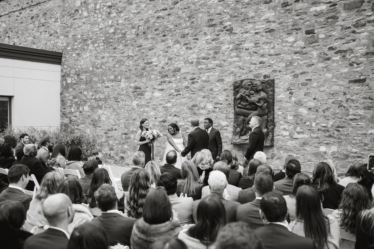 Brooke and Robert’s October wedding at the Michener Art Museum felt intentional from the first step into the courtyard. The trees held warm fall tones that framed the space naturally, especially in the museum’s open-air courtyard and sculpture garden, where their ceremony took place. The museum carries a rare kind of quiet grandeur. It invites celebration without overshadowing it. We moved through the galleries for portraits, letting art and architecture become a backdrop rather than a distraction. Brooke and Robert shifted easily between sincere moments and lighthearted ones, and that range made photographing them feel natural and unforced.