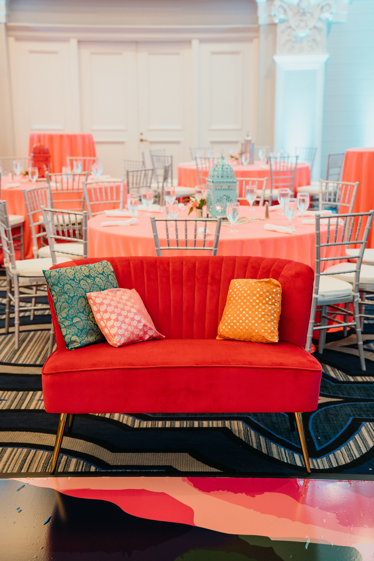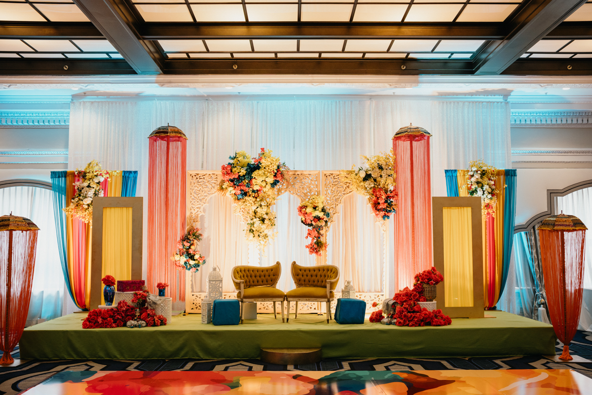 The first night was their Sangeet at the Notary Hotel in Center City, Philadelphia. And boy was it good. The room looked incredible. Bright colors everywhere, pink and yellow flowers overflowing across a stage draped in green. It was already buzzing before the music even started, and once it did the whole place lifted. Dancing, cheering, and that happy kind of chaos you always hope for at a Sangeet.