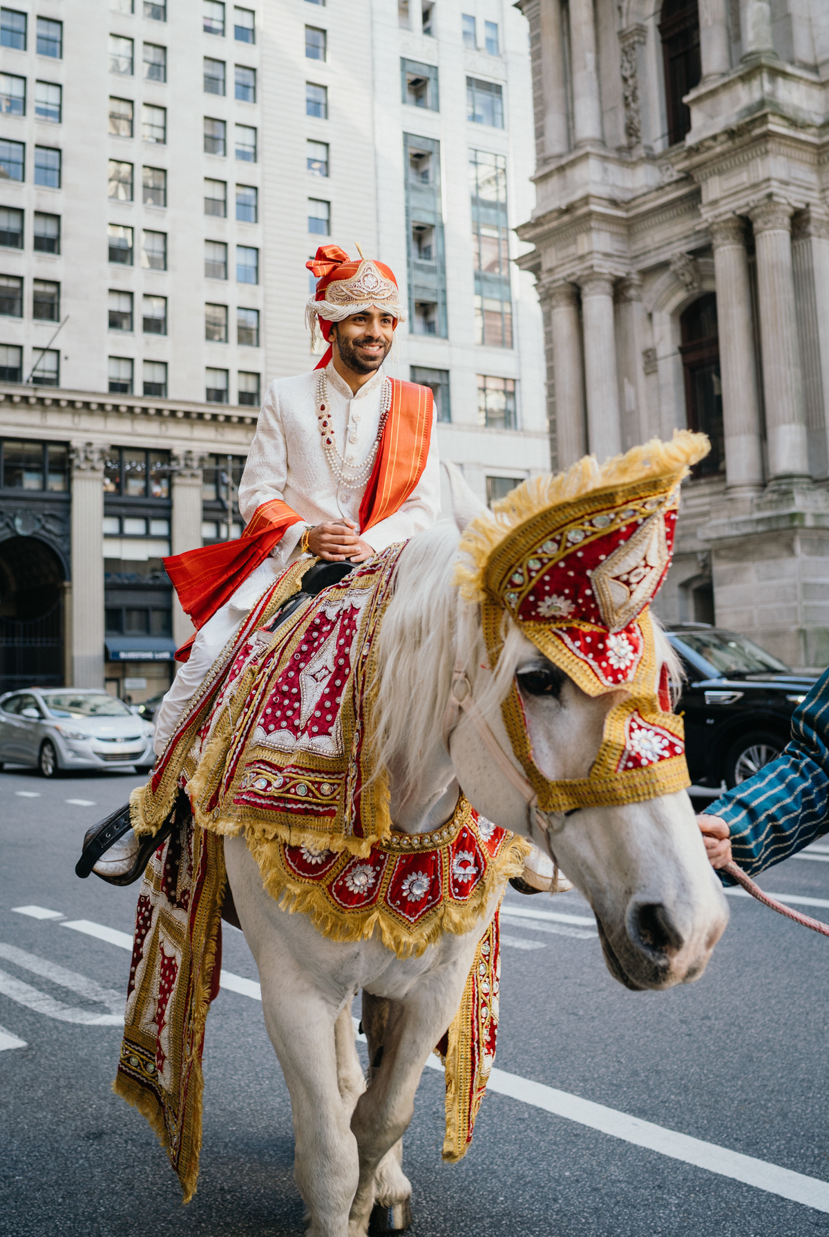 Day 2 of their Indian wedding weekend started back at the Notary Hotel, but the real beginning was their first look at City Hall. From there, the pace never slowed. The Baraat took over Broad Street, and Anand made one of the coolest entrances we’ve seen, riding in on a white horse as his family and friends danced and cheered him forward. Watching him open up and lean into the celebration was honestly awesome. You could feel the pride and excitement around him.